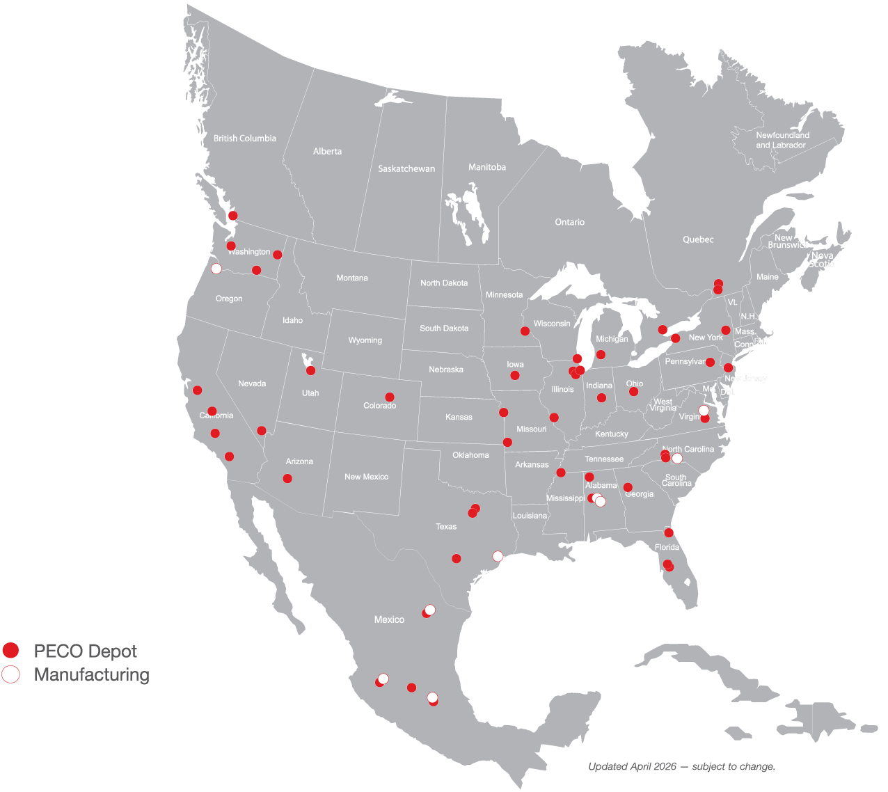 PECO Pallet's extensive North American service network includes 40+ full-service depots, 50+ sort and storage facilities, and 2,900+ pallet recovery locations that manage approximately 70 million annual pallet issues across the U.S., Canada, and Mexico.